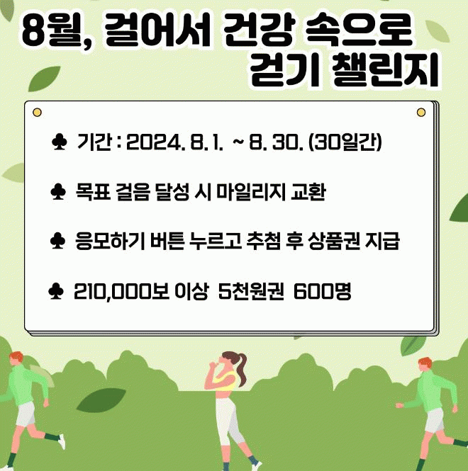 기간은 8월 1일부터 8월 30일까지로 1걸음에 1마일리지가 적립된다.