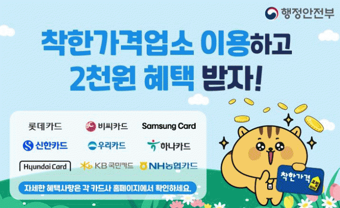 7월 NH농협카드와 삼성카드를 시작으로 8월부터 12월까지 롯데·비씨·신한·우리·하나·현대·국민카드로 착한 가격 업소에서 1만 원 이상 결제 시 2천 원 할인 혜택을 받을 수 있으며, 카드사별 행사 기간 및 할인 방법 등은 카드사 홈페이지에 상세하게 안내돼 있다.