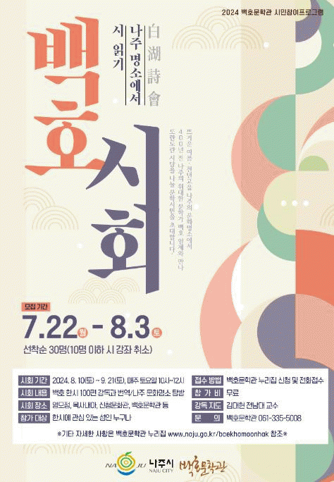 전라남도 나주시는 백호문학관 ‘백호시회’(白湖詩會) 참여 수강생 30명을 8월 3일까지 모집한다고 23일 밝혔다.