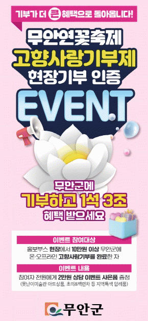 김산 군수는 “제27회 무안연꽃축제를 맞아 진행하는 고향사랑기부제 특별 이벤트 참여로 무안군에 따뜻한 마음도 전하시고 우리 지역 특색 가득한 답례품과 사은품을 추가로 제공받는 1석 3조의 혜택도 누리시길 바란다”며 “고향사랑기부제의 활성화를 마중물로 삼아 더 큰 무안 건설을 위한 노력에 최선을 다하겠다”고 말했다.