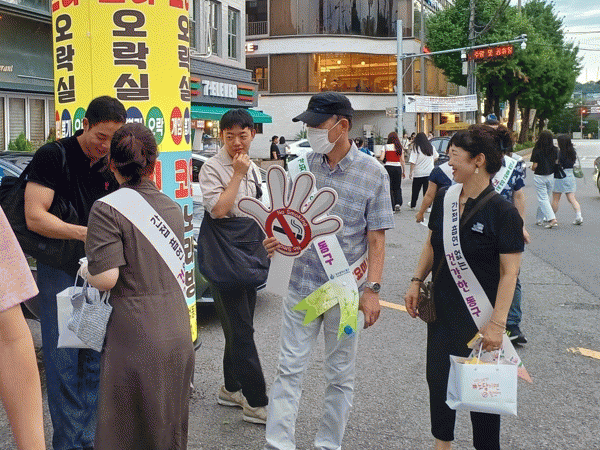 이번 캠페인은 길거리 흡연 민원 발생이 많은 동명동 골목 일대에서 유동인구가 많은 저녁시간에 진행됐으며 금연지도원과 보건소가 함께 참여했다.