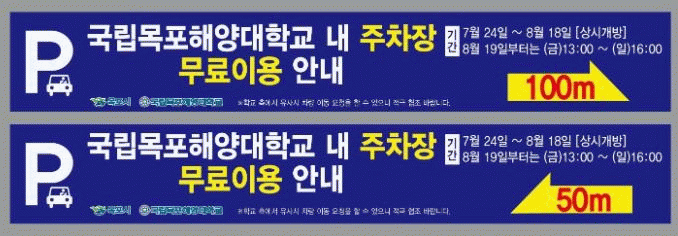 국립목포해양대학교 주차장은 평상시에는 금요일 오후 1시부터 일요일 오후 4시까지 개방하고 방학기간에는 전일 개방된다.