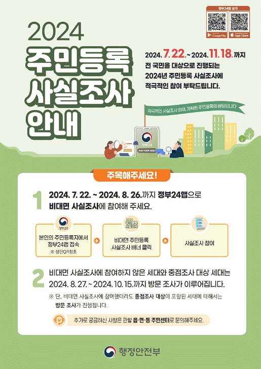 24일 시에 따르면 맞벌이 가구와 1인 가구 증가 등으로 방문 조사가 어려워짐에 따라 비대면 조사를 도입, 8월 26일까지 ‘정부24’ 앱을 통해 응답하는 방식으로 우선 시행한다.