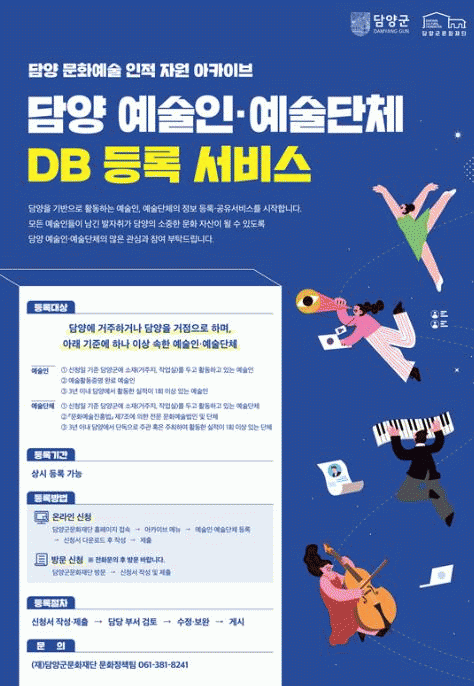 담양군문화재단에서 시행하는 DB 등록 서비스는 담양을 기반으로 활동하는 예술인과 예술단체를 대상으로 시행된다.