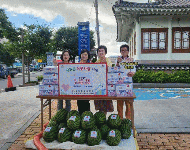 사진설명)㈜으뜸산업이 중복을 맞아 나주시 금남동에 어르신들을 위한 100만원 상당의 떡과 수박을 기탁했다.