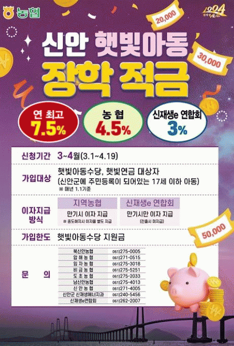 햇빛아동적금은 신안군에서 추진 중인 햇빛 연금 제도를 확대하여 수혜자의 범위를 확장하고 지역농협과 업무 협약으로 7.5% 이율의 적금 상품 출시를 통해 지역 아동의 학업을 위한 목돈 마련을 지원하는 측면에서 심사위원들의 호평을 받은 정책이다.