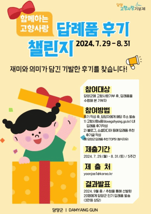 담양의 특색있는 답례품을 홍보하고 올바른 기부문화를 확산하기 위해 진행하는 이번 이벤트는 담양군에 고향사랑기부 후 답례품을 받은 기부자를 대상으로 한다.