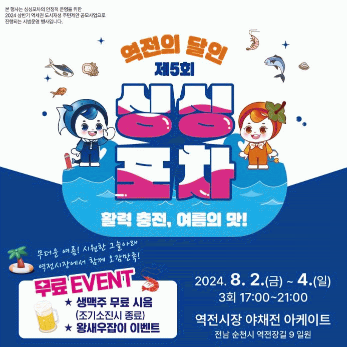 시 관계자는 “2024년의 무더운 여름에 열리는 순천의 첫 번째 수산물 축제”라며, “지난해 전국 최대 관광객이 방문한 순천에서 여름의 맛으로 활력을 충전하고, 어려운 경제 상황에도 힘을 낼 수 있는 자리가 되도록 최선을 다하겠다”고 전했다.