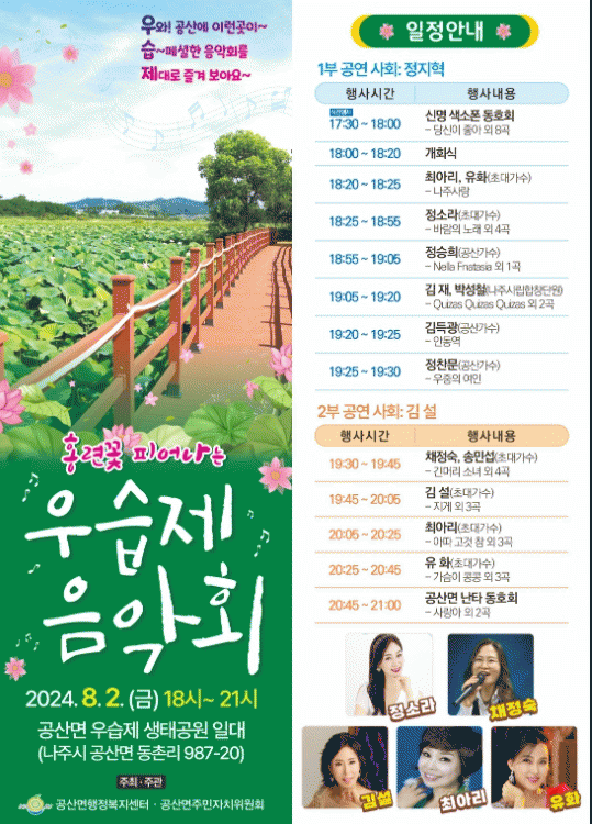 전라남도 나주시 공산면(면장 노세영)은 2일 오후 6시부터 우습제 생태공원 일원에서 제1회 홍련꽃 피어나는 우습제 음악회를 개최한다고 1일 밝혔다.