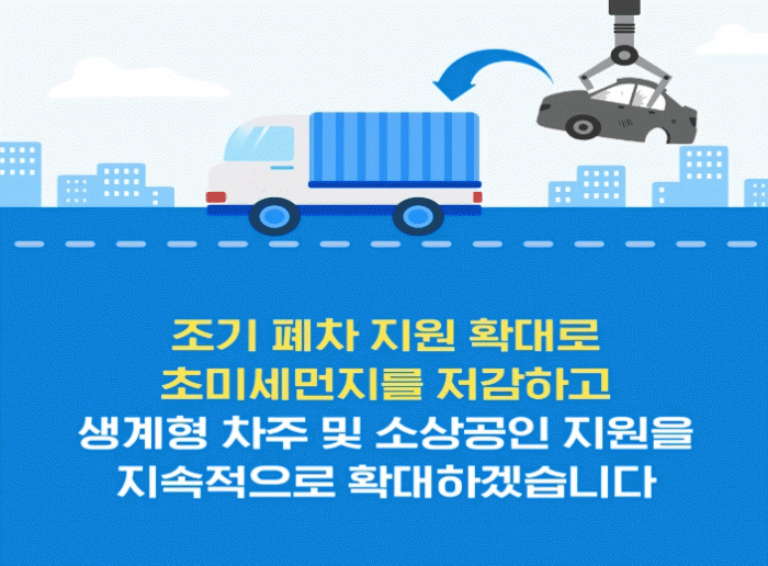 올해 2차례 조기 폐차 사업으로 368대 접수, 291대를 폐차 지원하며 보조금 약 6억 3천만 원을 지급했다. 사업 추진 과정에서 결격·포기 등의 사유로 발생한 예상 잔여 물량 50대(4등급 14대, 5등급 25대, 건설기계 1대)를 추가 지원한다.