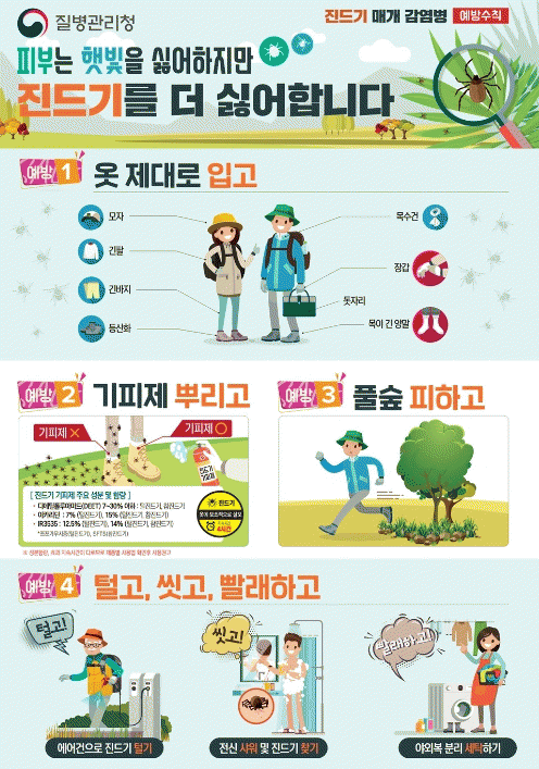 예방수칙으로는 ▲야외활동 전 모자, 긴팔, 긴바지, 등산화, 목수건, 장갑, 목이 긴 양말 착용으로 피부 노출 최소화하기 ▲진드기 기피제 뿌리기 ▲야외에서는 돗자리 등 깔고 앉기 ▲야외활동 후 털고, 씻고, 세탁하기 등이 있다.