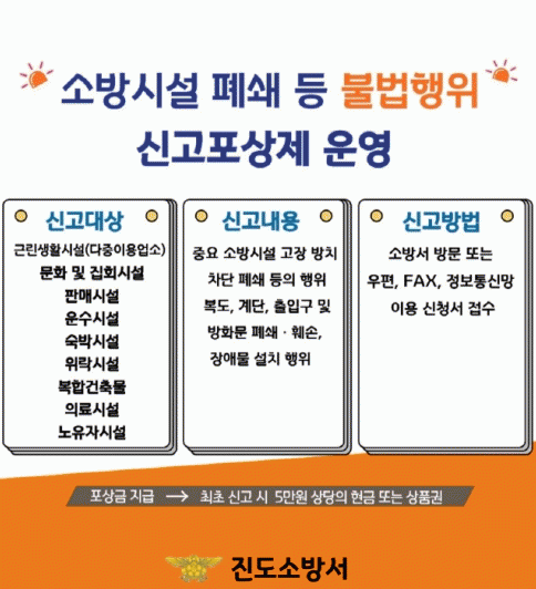 최초 신고 시 신고자에게 5만원(현금 또는 전통시장 온누리상품권), 같은 신고인이 2회 이상 신고 시 소화기 ? 단독경보형 감지기 등 5만원 상당의 소방시설을 지급하며 동일한 사람의 신고에 대한 포상금은 월간 30만원, 연간 300만원 이내로 포상을 받을 수 있다.