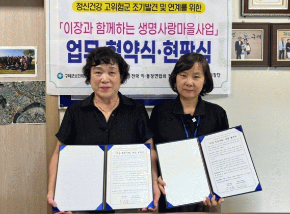 구례군은 2022년부터 자살 예방 마을 환경 조성을 위해 광의면 18개 마을 이장단과 협약을 맺어 “생명사랑마을”을 운영하고 있으며, 올해 구례읍 2개 마을 추가 협약으로 관내 155개 마을 중 20개 마을(13%)이 참여 중이다.