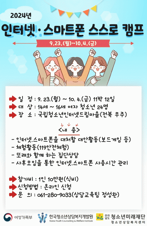 (재)전남청소년미래재단은 9월 23일부터 10월 4일까지 진행되는 인터넷·스마트폰 치유캠프 실시에 앞서, 캠프에 참여할 참가자 모집을 시작한다고 밝혔다.