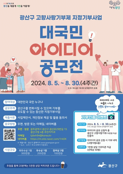 광산구는 아이디어 공모전 참여자 중 광산구에 10만 원 이상 고향사랑기부를 한 선착순 50명에게 1만 원 상당의 기프티콘을 지급하는 ‘기부 인증 이벤트’도 진행한다.