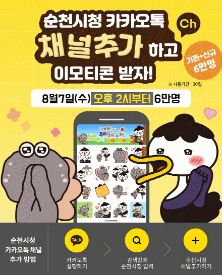 또한, 순천시청 카카오톡 채널을 추가하면 시정 소식, 문화예술 행사, 이벤트 정보 등 유용한 순천의 소식들을 매주 목요일에 정기적으로 받아볼 수 있다.
