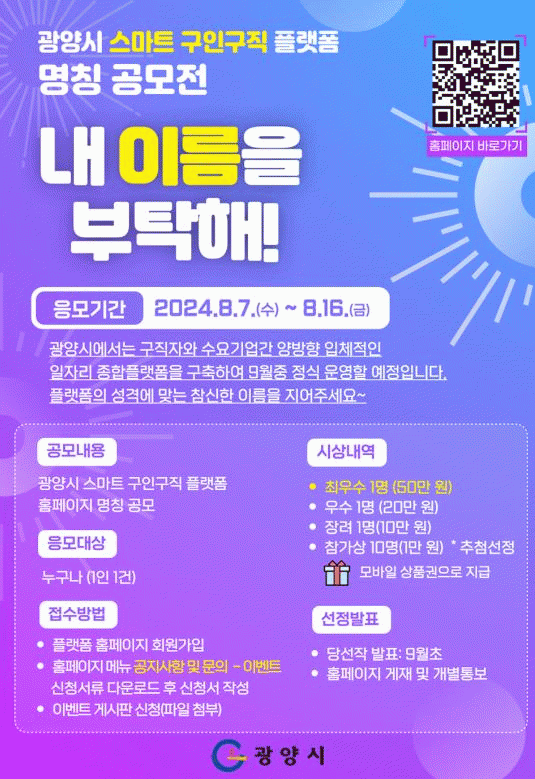 이화엽 미래산업국장은 “이번 스마트 구인구직 플랫폼 명칭 공모전에 많은 분의 관심과 참여를 부탁드린다”라며 “우리 광양시는 양질의 일자리 창출은 물론 구인난과 구직난을 해소하는 데 최선을 다하겠다”라고 말했다.