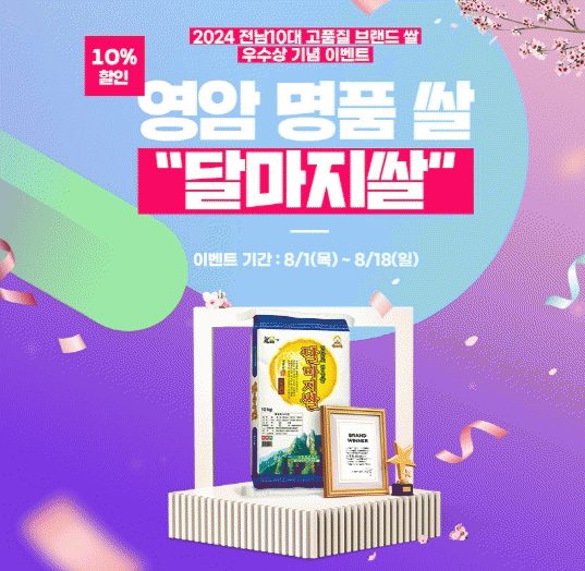 영암군은 9월 말까지 ‘쌀 소비촉진 범군민운동’을 추진하고 있고, 영암군 농특산품 온라인 판매장 ‘영암몰’에서는 전남 10대 브랜드 쌀 선정 기념이벤트로 10% 할인가로 달마지쌀을 판매하고 있다.