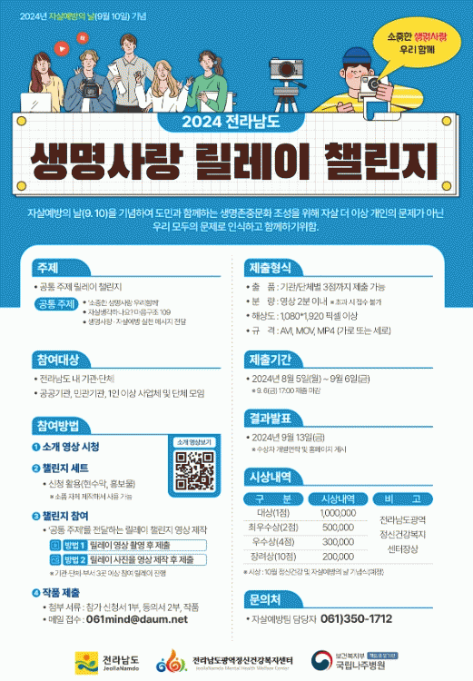 참여를 원하면 ▲전남광역정신건강복지센터 누리집 및 유튜브 채널소개영상을 시청한 후 ▲3개 이상(기관/팀) 참여 릴레이영상을 제작해 ▲전라남도광역정신건강복지센터 메일로 9월 6일까지 제출하면 된다.