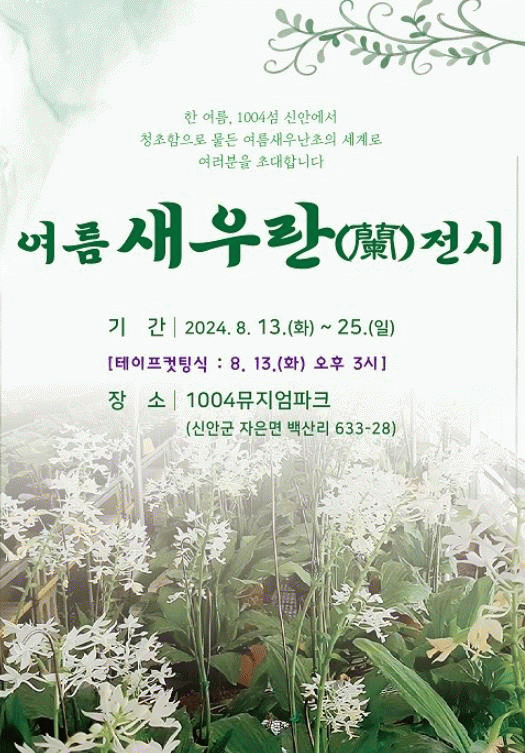 이번 행사는 신안군농업기술센터에서 보유한 새우란 중 여름새우란 원종 100여 점을 비롯해 풍란, 흑산비비추 등 도서 자생식물도 함께 전시할 예정이다.