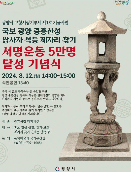제자리 찾기 추진위원회와 사회단체의 적극적인 동참으로 6개월 만에 달성한 서명운동 5만 명 달성 기념식은 축하공연, 홍보 영상 상영, 추진 경과보고, 제자리 찾기 건의문 낭독 등으로 진행될 예정이며 광양시민이면 누구나 참여할 수 있다.