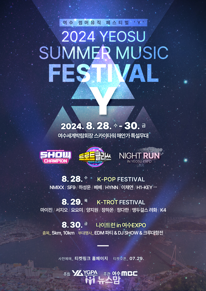 ‘썸머뮤직페스티벌 Y’ 행사는 여수광양항만공사가 주최하고, 여수MBC가 주관하며 ▲28일(수) K-POP(생방송 MBC 쇼챔피언) ▲29일(목) K-TROT(MBC 트로트클라쓰) ▲30일(금) K-SPORT(여수 나이트런 마라톤)으로 구성됐다.