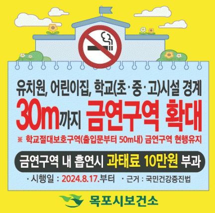 목포시 보건소 관계자는 “목포시에서는 금연구역 확대에 대한 적극적인 홍보를 통해 아동과 청소년을 간접흡연의 피해로부터 보호하고 건강한 교육환경을 조성하기 위해 지속적으로 노력하겠다”고 전했다.