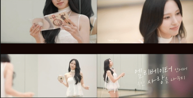 영상 속 미나는 연습실 한편에 앉아 쉬던 중 박진영의 음반을 CD플레이어로 재생했다. 이어 박진영의 '엘리베이터' 음원 일부가 흘러나왔고, 미나는 자연스럽게 리듬을 타기 시작했다. 흥이 오른 미나는 자리에서 일어나 자신만의 그루브를 보여주며 보는 이들에게 기분 좋은 설렘을 안겼다.
