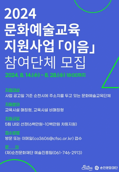 자세한 사항은 순천문화재단 누리집공고문을 참조하거나 예술진흥팀으로 문의하면 된다.