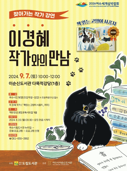 이경혜 작가는 오는 9월 7일 오전 10시에 이순신도서관에서 ‘책의 탄생 과정과 독서의 즐거움’을 주제로 『책 읽는 고양이 서꽁치』책 소개와 집필 과정, 책에 언급된 도서들에 대해 강연하고 퀴즈를 통해 독자와 질의응답 시간을 가질 예정이다.