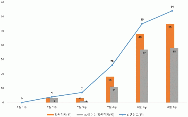 입원환자 가운데 65세 이상은 69.1%(38명)로, 7월 4주부터 60% 이상을 차지하고 있다. 이밖에 19~49세 16.3%(9명), 50~64세 12.7%(7명) 순으로 나타났다.