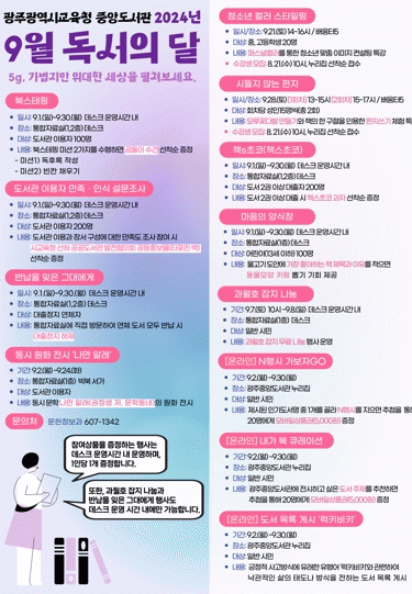 자세한 내용과 일정은 광주중앙도서관 누리집과 최상준도서관 누리집에서 확인할 수 있다.