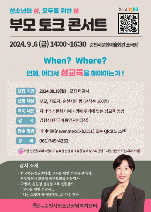 토크 콘서트 방식으로 진행되며 △자녀의 성문화 이해 △성장 주기 맞춤형 성교육 △일상에서 양육자가 실천할 수 있는 구체적인 성교육 방법 등에 대해 참가자들과 함께 나눌 예정이다.