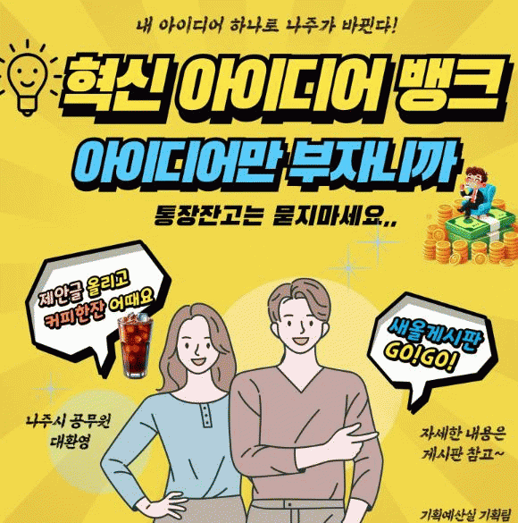 나주시는 민선 8기 시정 전반에 대한 공무원의 정책 제안 창구인 ‘나주 혁신 아이디어 뱅크’를 올해 첫 운영한다고 19일 밝혔다.