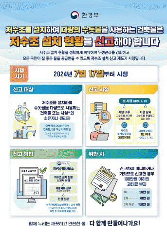또한, 법 시행 당시 저수조를 운영 중인 해당 건축물의 소유자나 관리자도 시행일로부터 1년 이내(2025.07.16.까지)에 저수조 설치 현황을 신고해야 한다.
