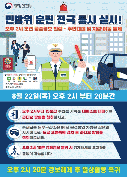 오후 2시15분 훈련 경계경보가 발령되면 시민은 대피소에서 나와 경계 태세를 유지하면서 통행이 가능하다. 이어 오후 2시20분 훈련 공습경보가 해제되면 일상으로 복귀하면 된다.