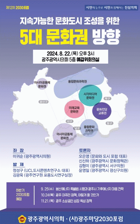 토론자로 오은영 포럼 문화와 도시 대표, 김형미 서구의원, 윤영일 광산구의원, 신신하 광주광역시 문화정책관 등이 참여한다.