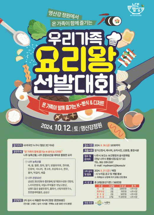 대회의 주제는 '온 가족이 함께 즐기는 K-분식·디저트'로 나주의 농특산물과 관광 10선을 활용해 다채로운 요리를 선보일 예정이다.