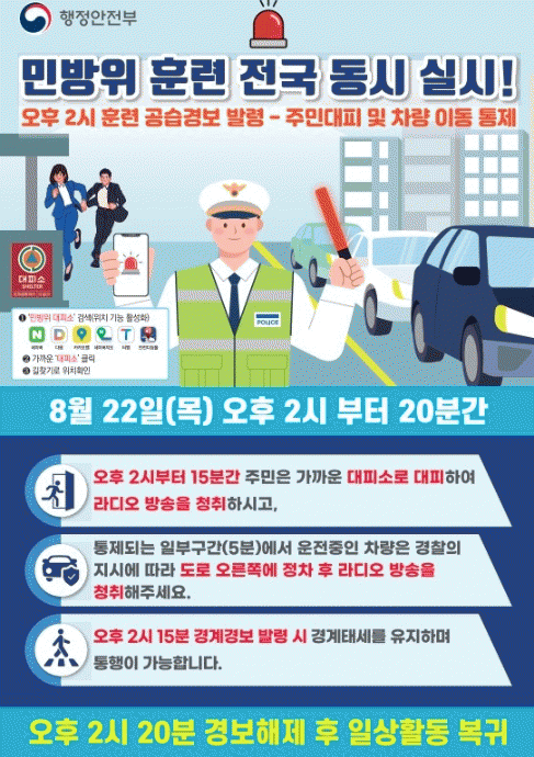 아울러, 민방위 대원이라면 누구나 전국 동행정복지센터에서 대피 유도 요원, 이동 통제 요원을 접수해 참여할 수 있고, 당해연도 민방위 교육 수료를 인정받게 된다.