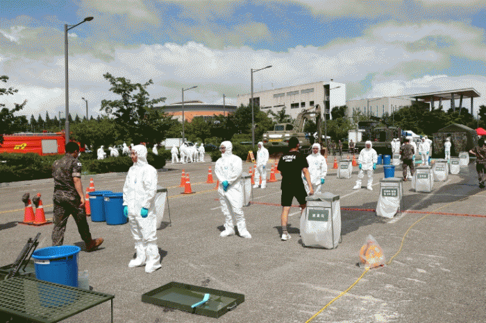 현장에는 제독차, 정찰차, 버스, 구급차, 굴삭기, 에어텐트, 문형계측기, 개인선량계 등 20여 종의 장비를 동원하여 실전을 방불케 하는 장비로 핵 및 대량살상무기(WMD) 사후관리 영상시청 ▲방사능 피해자의 부상정도에 따라 식별하여 피해주민에 대한 환자 분류와 제염 ▲긴급처치 ▲오염물질 매몰▲인체 및 장구류 제염에 필요한 비눗물과 물 제공 ▲피복과 장비보급 ▲병원 후송 순으로 훈련이 진행됐다.