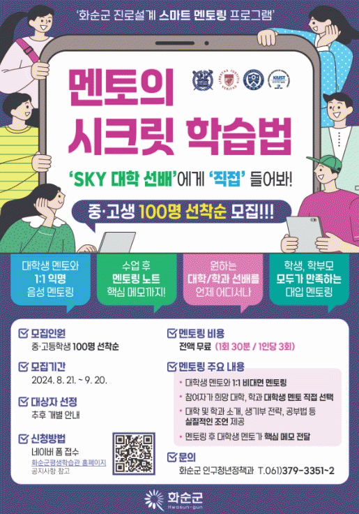 조미화 인구청년정책과장은 “대학생 1:1 멘토링 상담 서비스를 제공하는 ‘스마트 멘토링’사업을 통해 우리 지역 학생들이 수도권 학생들과의 입시 정보 격차를 해소할 수 있을 것”이라며, “이번에 중학생까지 확대 모집하는 만큼 많은 학생이 참여하여 학생 각자가 원하는 진로·진학 및 학습 설계 등에 많은 도움이 됐으면 한다.”라고 말했다.