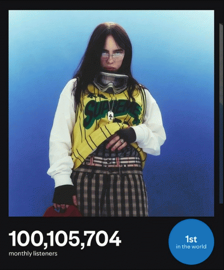 오늘(21일) 유니버설뮤직은 “지난 5월 17일 세 번째 정규 앨범 [히트 미 하드 앤드 소프트(HIT ME HARD AND SOFT)]를 발매한 빌리 아일리시가 이번에 스포티파이 월 청취자 수를 1억 명이나 돌파했다”라며 “플랫폼 역사상 월 청취자 수를 1억 명을 넘긴 것은 총 3명뿐이며 빌리 아일리시는 이 중 최연소”라고 의의를 전했다.
