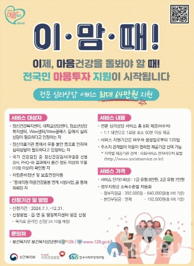 군 관계자는 “정신건강에 대한 사회적 인식 개선 및 진입 장벽을 낮춰 이제는 누구나 마음 건강을 돌봐야 할 때”라며 “정서적 어려움을 겪고 있는 군민들이 ‘전국민 마음투자 지원사업’을 통한 전문 심리상담으로 그 어려움을 극복할 수 있기를 바란다”라고 말했다.