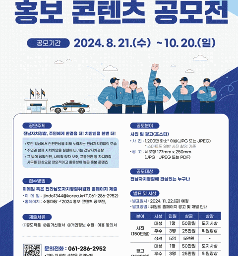 우수 작품 선정은 1차 내부심사와 2차 전문가 심사위원회를 거쳐 11월 확정되고, 입상자에게는 최대 50만 원의 상금과 전남도지사상, 전남도자치경찰위원장상이 수여될 예정이다.