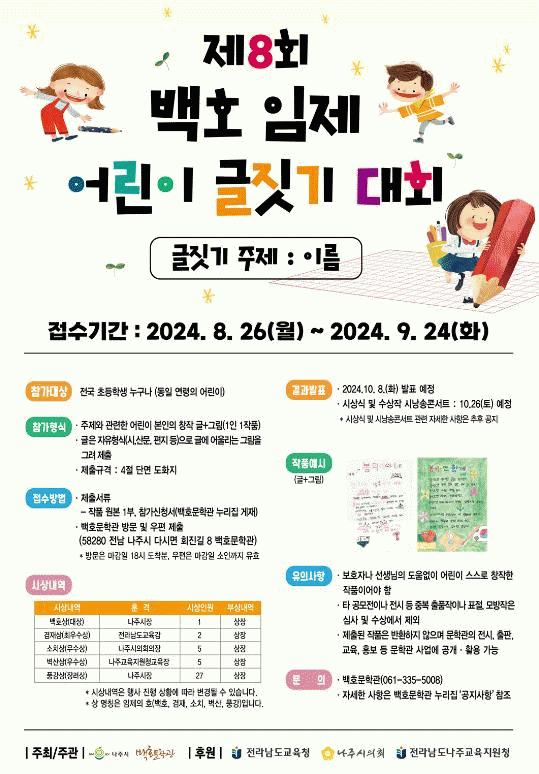 나주시 관계자는 “이번 대회에서 아이들이 자신을 대표하는 이름에 대해 새롭게 생각하는 기회가 되길 바란다”며 “자유롭게 자신만의 경험과 생각을 표현한 다양한 작품이 많이 접수되길 기대한다”고 전했다.