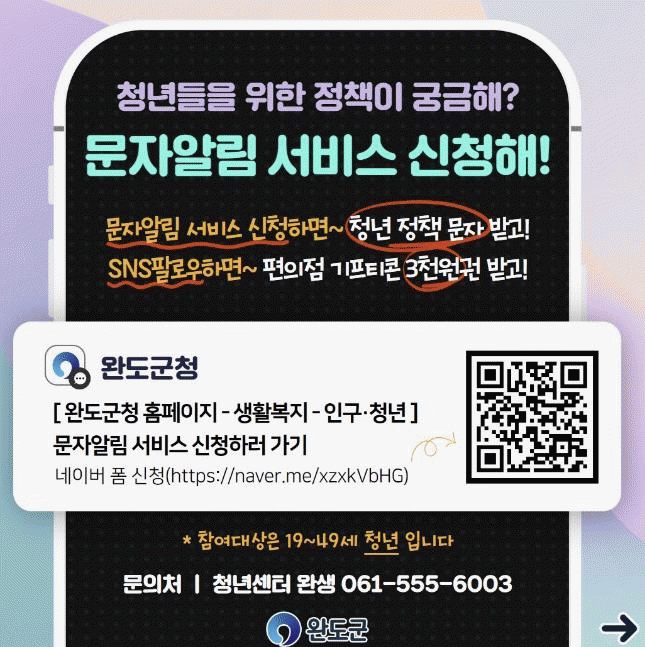 10월 3일까지 문자 알림 서비스 신청 후 완도 청년센터 완생 SNS(페이스북, 인스타)를 팔로우하면 기프티콘을 지급하는 이벤트도 진행한다.