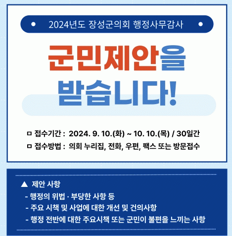 제안 대상은 ▲현재 장성군에서 추진하고 있는 사업에 대한 개선·건의사항 ▲행정 전반에 대한 주요 시책 또는 군민이 불편을 느끼는 사항 ▲행정의 위법·부당한 사항 등 행정사무감사 전반에 관한 사항이다.