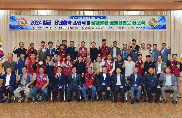 시에 따르면 23일 오후 2시 시청 대회의실에서 전국플랜트건설노조 여수지부(지부장 김정환)와 여수산단건설업협의회(회장 김경수), 정기명 여수시장, 문갑태 여수시의회 부의장, 이경근 고용노동부여수지청장, 한문선 여수상공회의소 회장 등 40여 명이 참석한 가운데 임금·단체협약 체결과 상생발전 공동선언문 발표로 진행됐다.