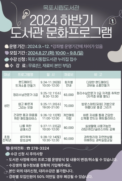 수강 신청은 오는 27일 오전 10시부터 목포시통합도서관 누리집에서 가능하며 모든 강좌는 무료(단, 교재비 및 재료비 본인 부담)이다.