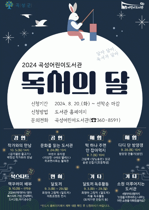9월 3일부터 29일까지 최영아 작가의 그림책 ‘달토끼’의 아트프린트 전시와 토끼 가면 만들기 등 자율 독후활동이 진행되고, 9월 7일에는 초등학생을 대상으로 그림책 ‘달님송편’을 읽고 송편만들기 체험행사를 진행한다.